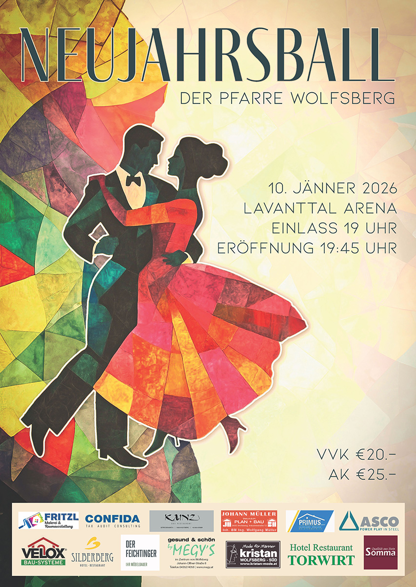 Karten- und Tischreservierungen für den Neujahrsball der Pfarre Wolfsberg sind ab sofort im Pfarrbüro erhältlich. Rufen Sie uns gerne an unter 04352/2452, um Ihre Plätze zu sichern.